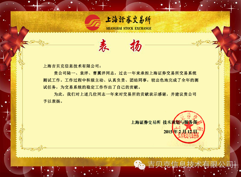 近日,吉貝克喜獲上海證券交易所的表揚信。上證所高度肯定了吉貝克團隊的工作成績。吉貝克在2014年承擔上證所的交易系統(tǒng)測試工作,以嫻熟的技術、優(yōu)質的服務為前提,以為客戶創(chuàng)造最高價值為己任,嚴把產(chǎn)品質量,為交易系統(tǒng)的穩(wěn)定運行做出了突出的貢獻。信中特別點名表揚了我司陸一、袁洋、曹翼翔同志,稱贊這三位同事積極主動、認真負責、團結同事。